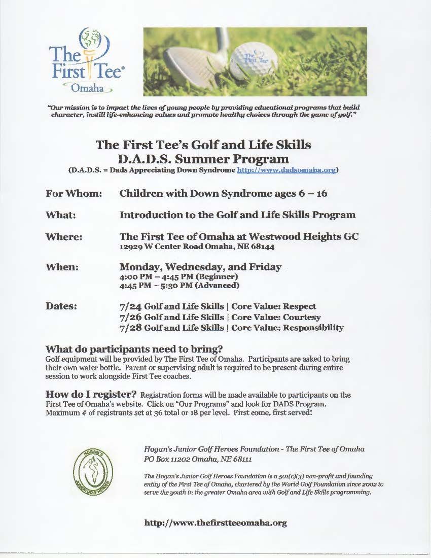 Thank you for your interest in our Golf and Life Skills program. Our D.A.D.S. summer program is open to youth with Down Syndrome, ages 6-16. To register your child, please click the "Register Here" link below. See you on the tee!