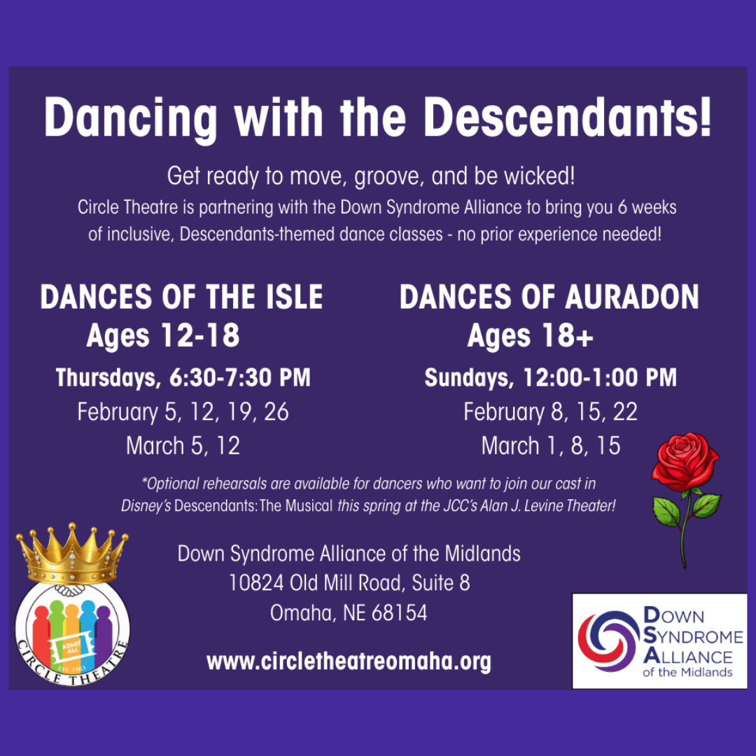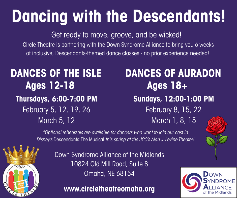 DSA is excited to partner with Circle Theatre to provide inclusive dance and choreography classes inspired by Disney's Descendants! These classes are designed for dancers of all abilities and will support those that choose to participate in Circle Theatre's Spring 2026 production. Those that want to be part of the production will stay an extra hour after the class to rehearse with the crew.