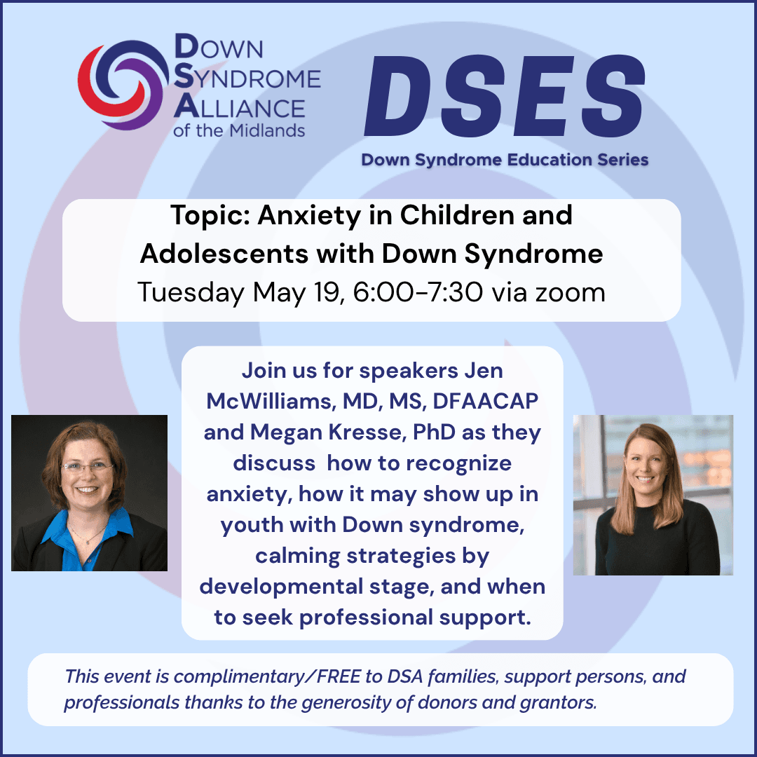 This presentation will describe anxiety and how to identify it, how this might look in youth with Down syndrome, strategies for calming children at different developmental stages, as well as giving information on when to seek professional help and treatment options. It is aimed toward family or professionals serving youth with Down syndrome.