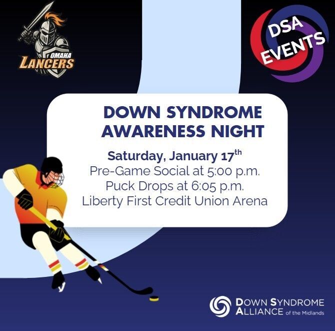 DSA and the DSAF (Lincoln) are bringing our communities together for this Down Syndrome Awareness Night with the Omaha Lancers! Join us for a pre-game social with our families in the pre-function ballrooms at 5:00 p.m. and then for the game that starts at 6:05 p.m. Tickets are $18.11 each, which includes fees, and can be purchased at the link provided.